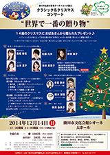 ♪2014.12.14 掛川市出身のアーティストで綴る クラシック&クリスマスコンサート “世界で一番の贈り物” 掛川市文化会館シオーネ・大ホール → イベント詳細はこちら 主催:(公財)掛川市生涯学習振興公社、掛川市 |